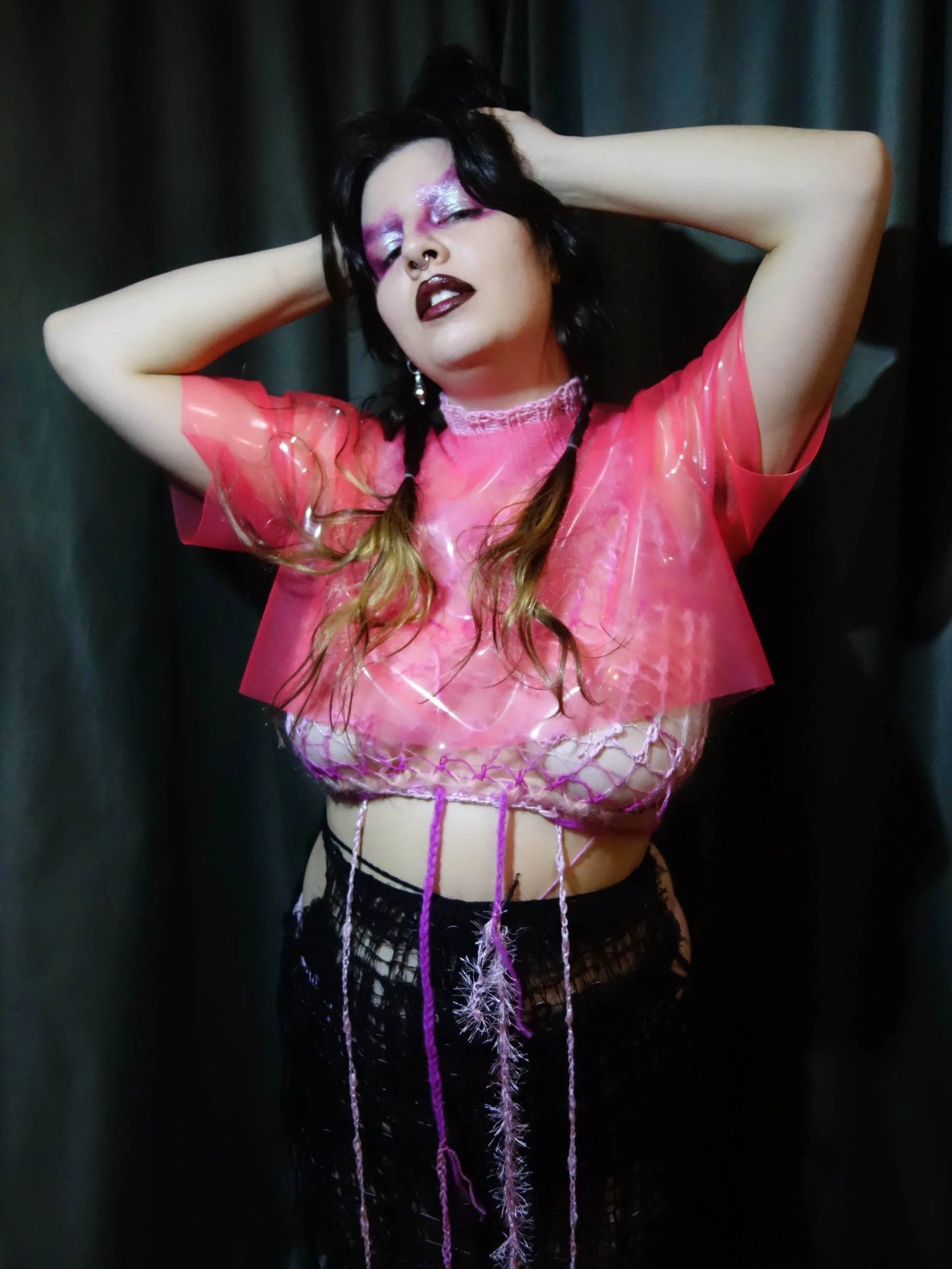 Bára Wünscher is an amazing knitter with an unforgettable style and make-up. We both are passionate about handcrafting and unusual aesthetics, so we have combined her knitted artwork with our natural latex treasures to create the pinkest look. We weren't trying to take perfect photos. Our aim was to capture Bára's supernatural presence in a world shaped by artificial intelligence and digital enhancements.