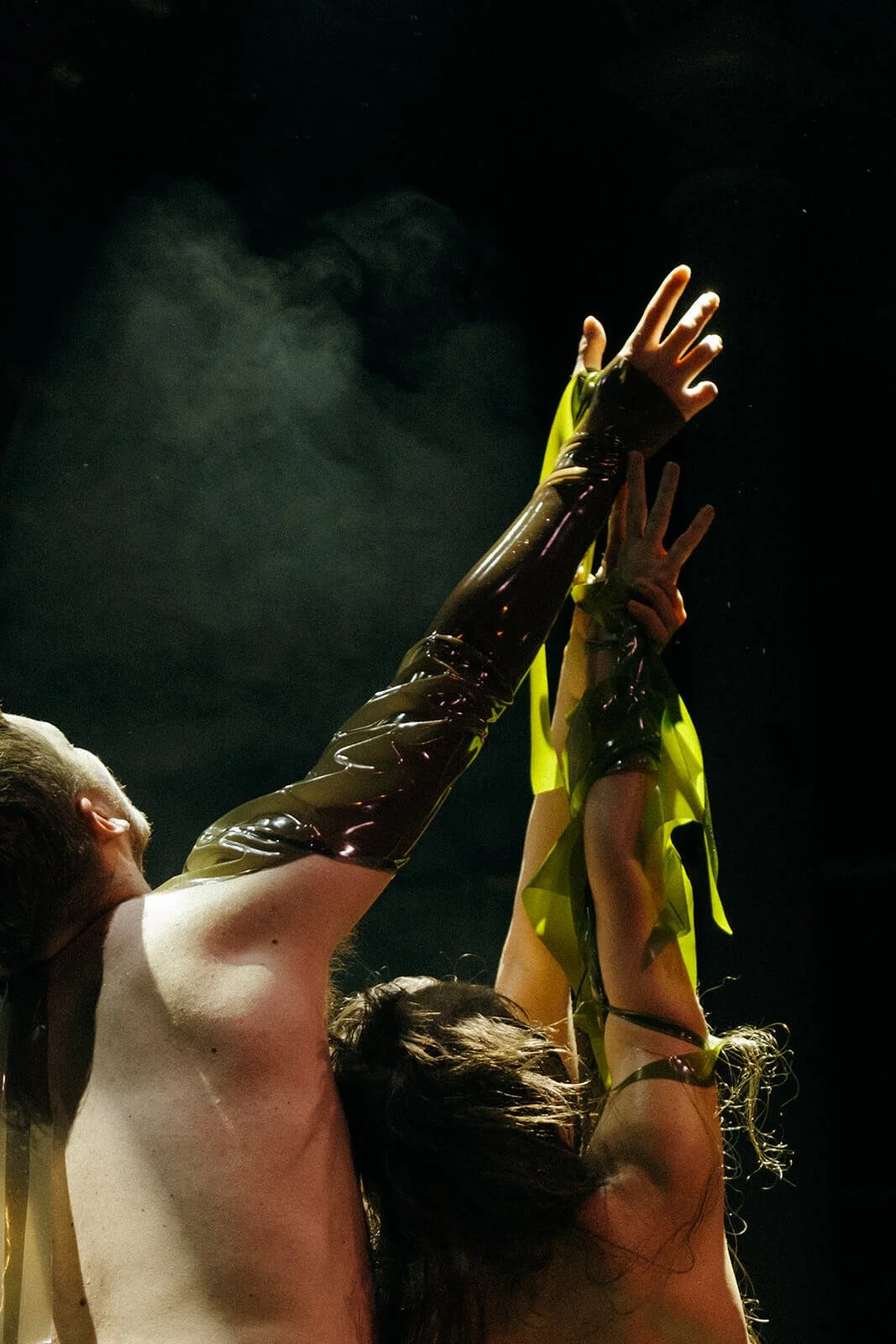 The performers embody animals in a mystical, outsider world, awakening from a crouched state and forming a circle, bound by a latex belt symbolizing captivity and restraint. Fog and spotlights create an otherworldly atmosphere, emphasizing primal unity and initial tension.