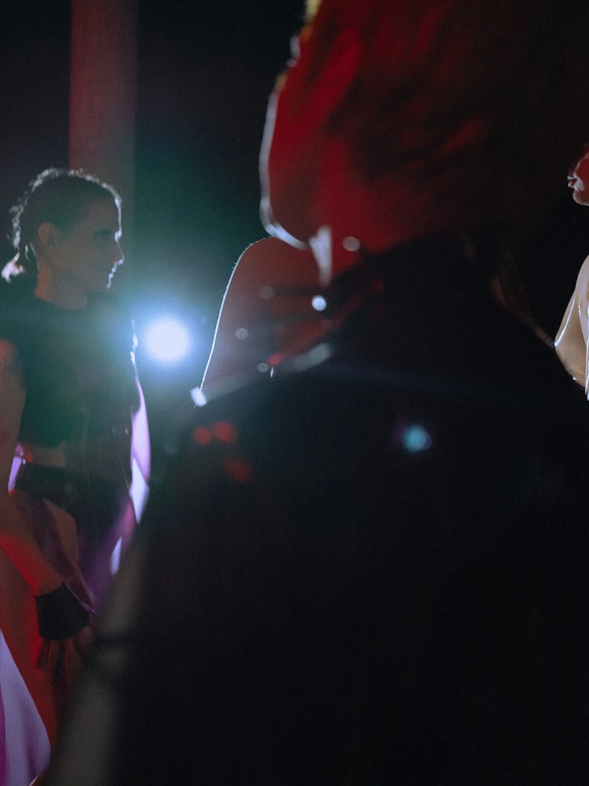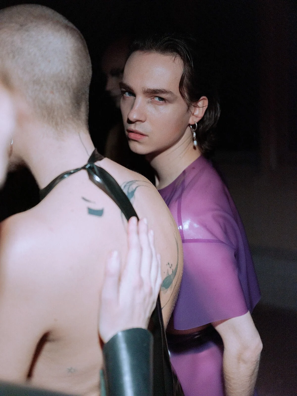 As more performers joined in, the stage transformed into a vibrant tapestry of personalities flowing through the space. The performance reached a pivotal moment when attention focused on Tomáš, who confronted his inner demons at center stage. Surrounded by fellow performers, he underwent a symbolic transformation — a moment when his look was enhanced with additional pieces from Noctum's collection. This act represented not just a change in appearance but a transformation of self, capturing the brand's ethos of embracing individuality.