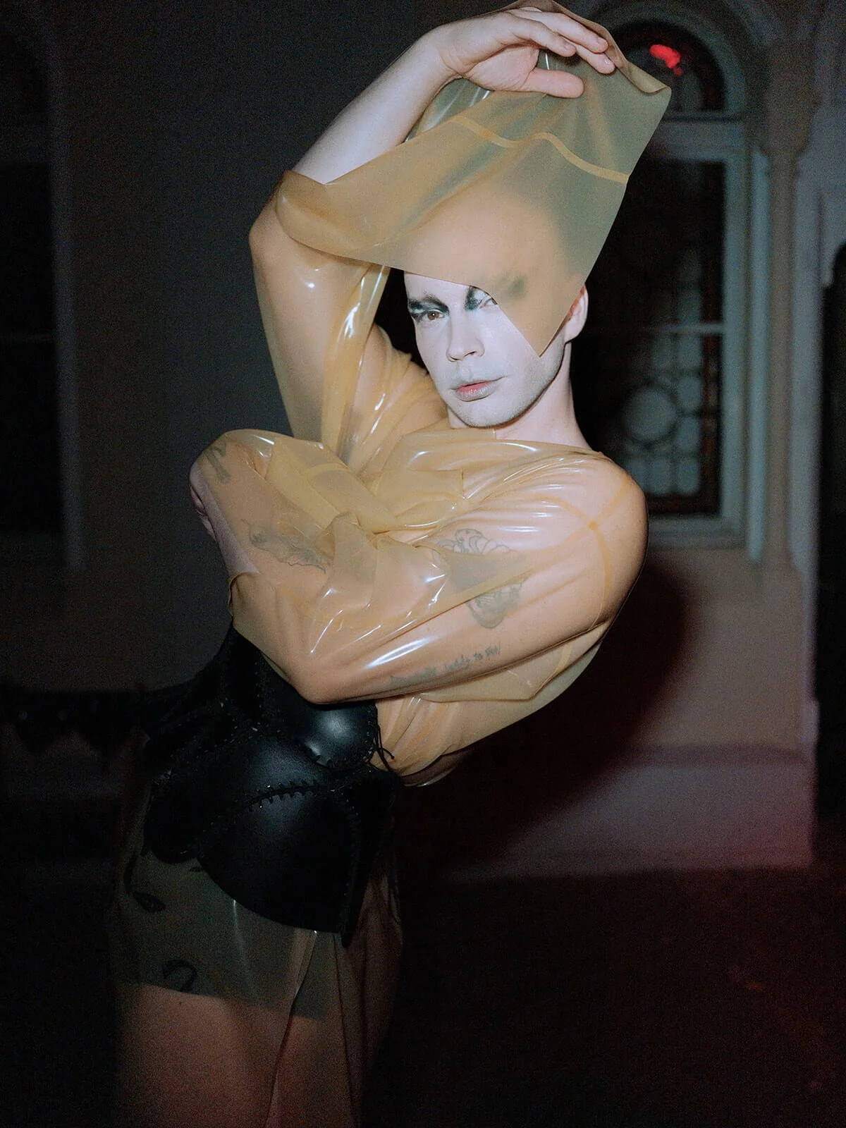 The performance started with Tereza Silon´s somatic vocal entry. Silon captivated the audience with their sound piece inspired by their work "Good Gardens" (2023-now) and "ESOPHAGUS: EveryBody Ecstatic" (2021). Their introduction set the tone for what was to come — an unconventional showcase that promised to challenge expectations and engage the senses. From the very beginning it was clear that this would not be a traditional runway show. Silon tried to create an atmosphere that was both intriguing and unsettling, altering the energy of the space dramatically.